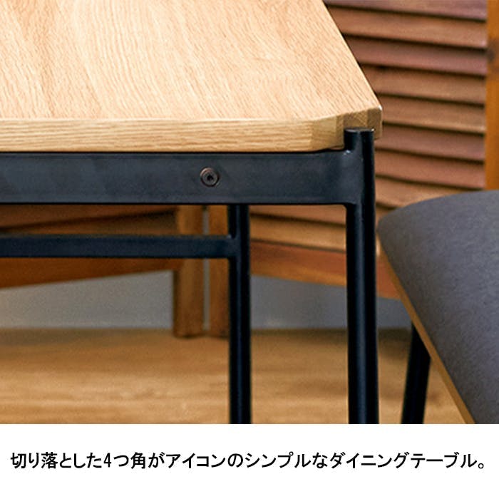 オーク材とスチール素材で構成されたダイニングテーブル。切り落とした4つ角が特徴的です。クリア塗装で仕上げた木部と直線のスチールでシンプルに構成されており、主張せずお部屋に馴染むデザインとなっています。シンプルな形状でダイニングから食事・仕事・趣味にも活躍できます。