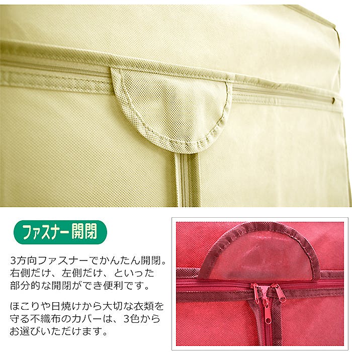 3方向のファスナーでかんたん開閉。右側だけ、左側だけ、といった部分的な開閉が可能。パーツを差し込むだけのかんたん組立です。ドライバーなどの工具は一切不要。組み立てが苦手な方や、工具をお持ちでない一人暮らしの学生さんなども、パパっと作ることができます。2段掛け用パイプを使わない時は、底部に差し込んで収納しておけます。