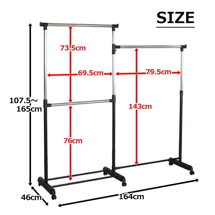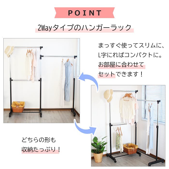 2wayタイプのハンガーラック。横に並べたりL字にしたり、お部屋に合わせてセットできます。高さは107.5~165cmに調整可能。移動に便利なキャスターも付いています。