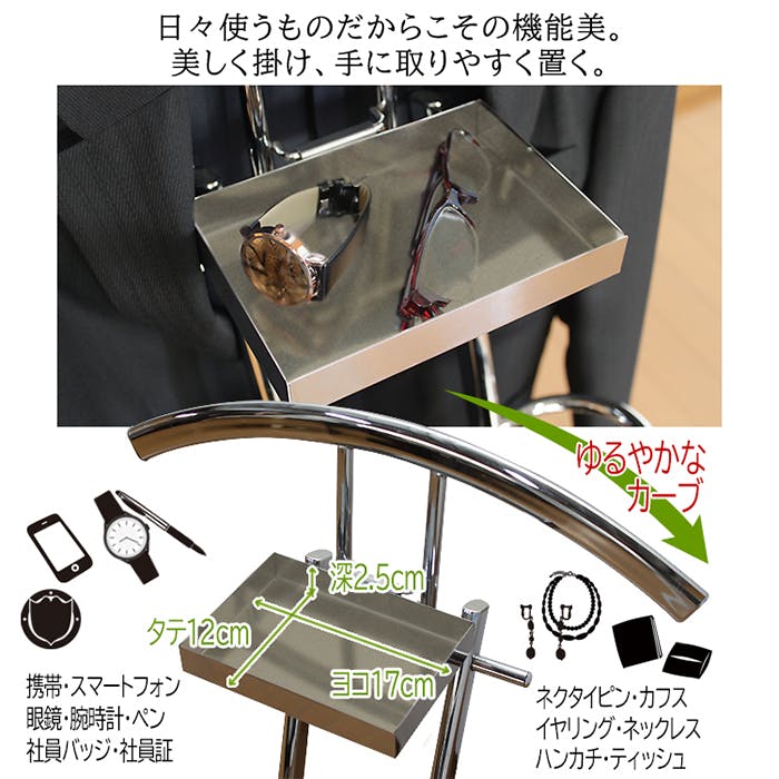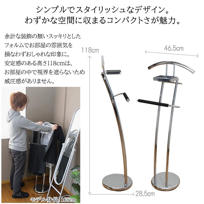 わずかな空間に収まるコンパクトさが魅力、シンプルでスタイリッシュなスーツラックです。余計な装飾のないすっきりとしたフォルムはお部屋の雰囲気を損ないません。