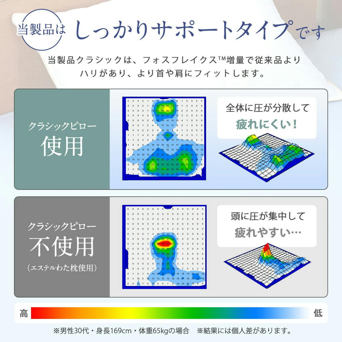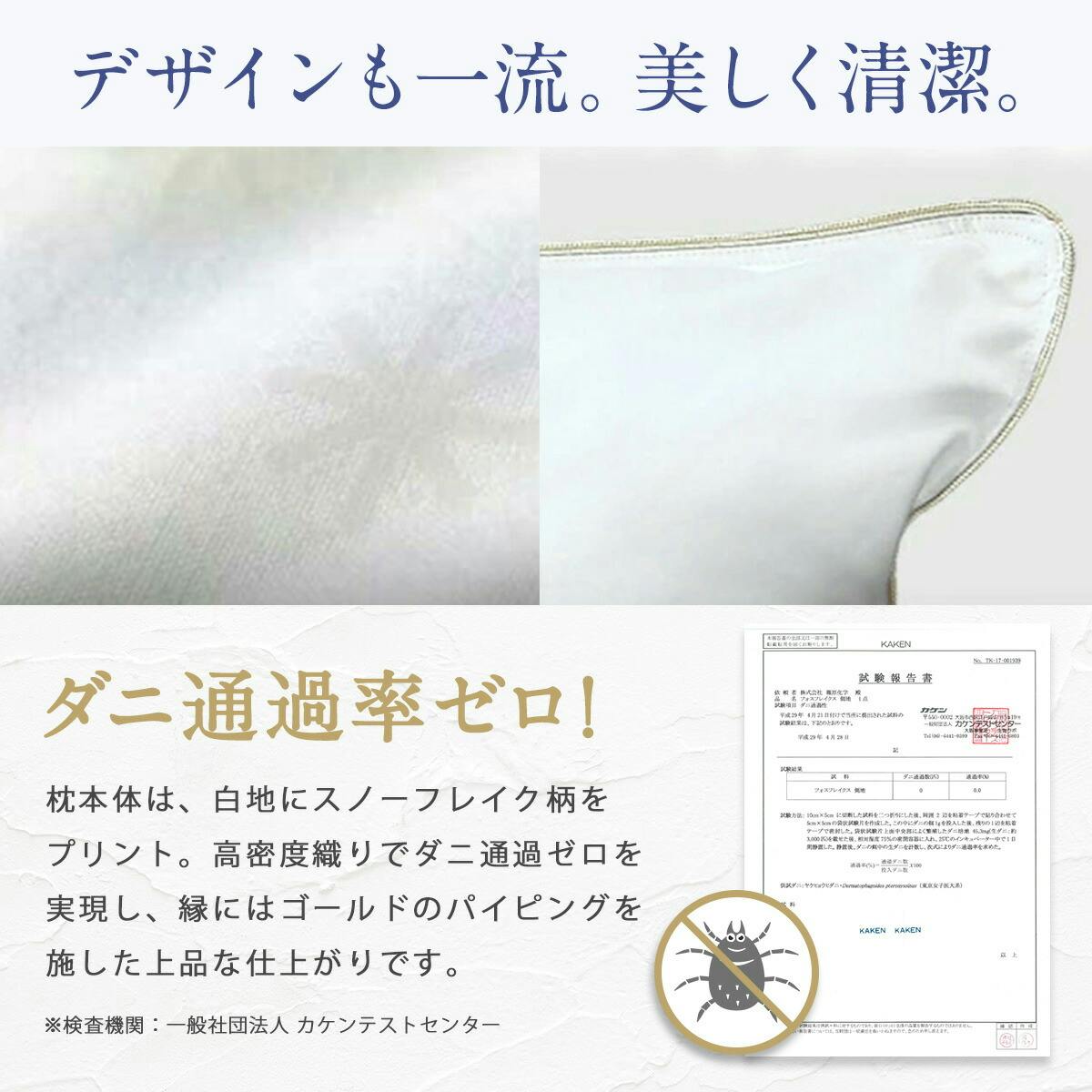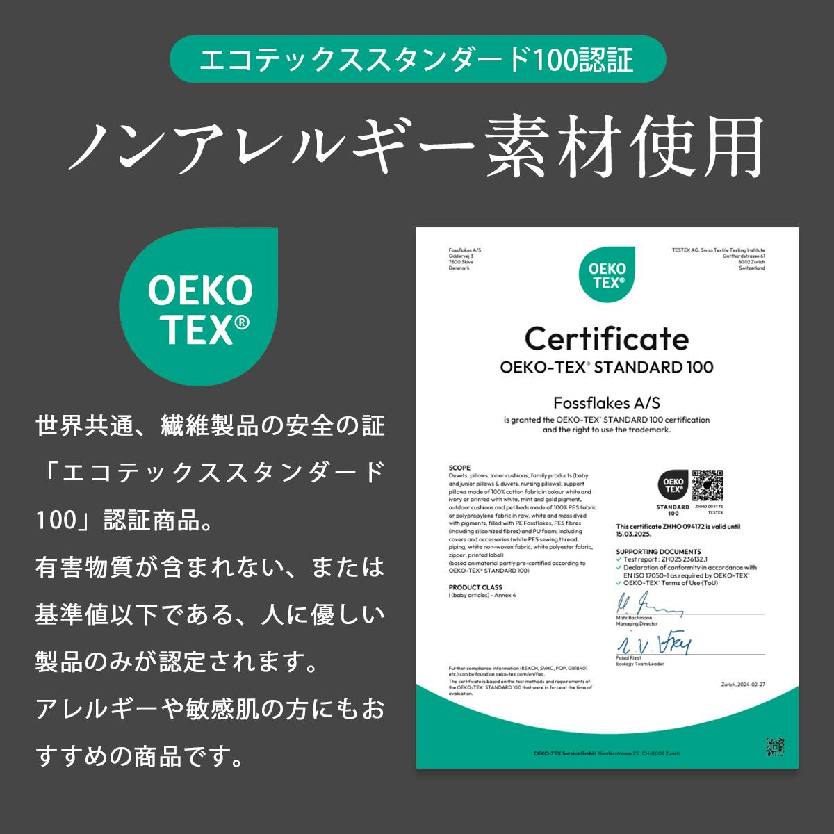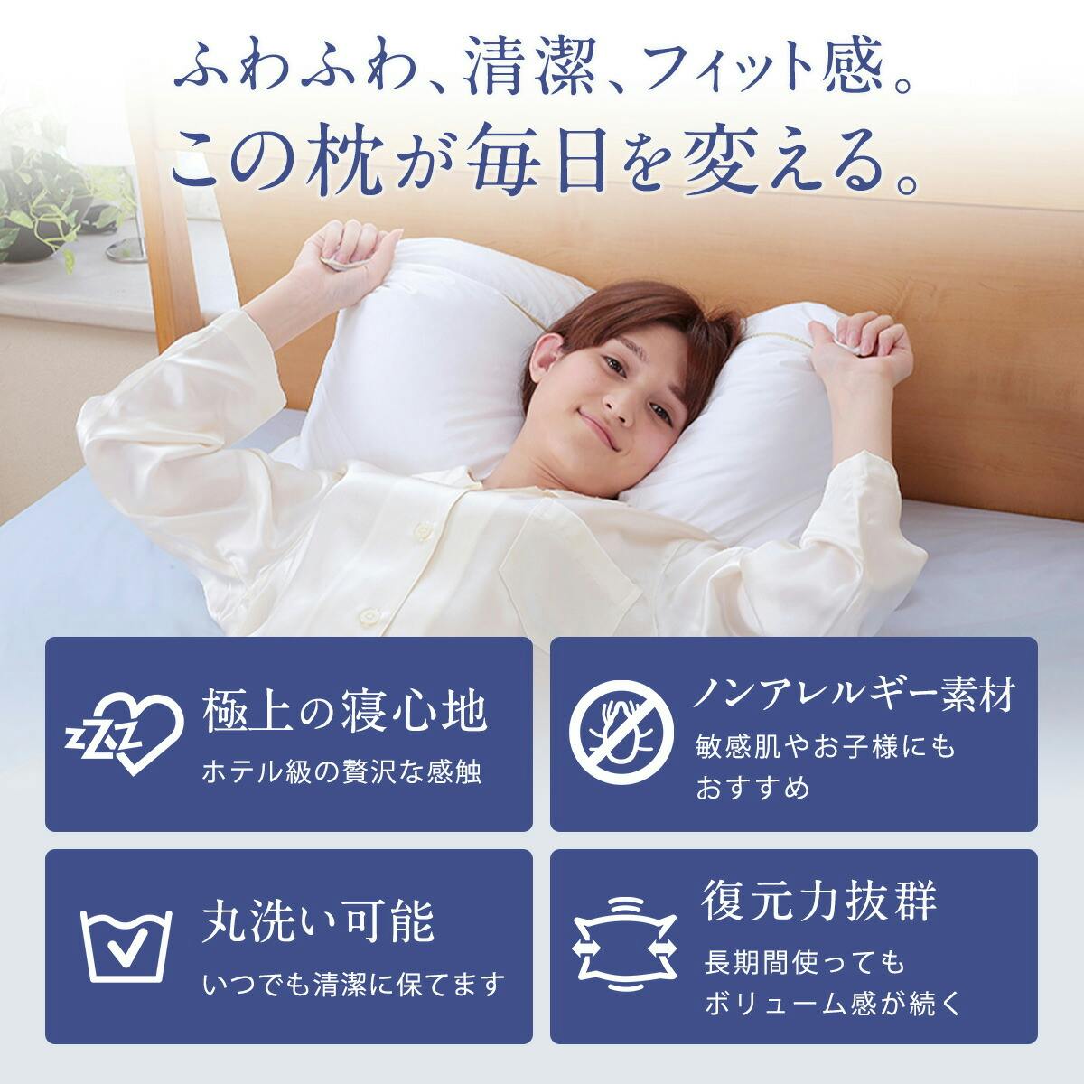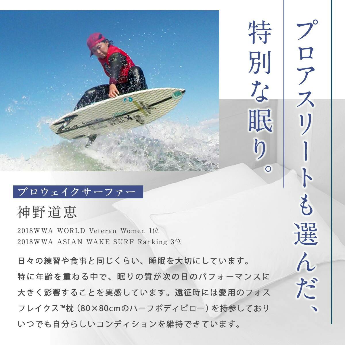 フォスフレイクス社の創業当初から愛され続ける最上級モデルで、ふんわり感と弾力を両立した特許素材フォスフレイクス™を贅沢に使用しています。通常モデルより約8%多く中材を充填しており、より上質なボリュームとホールド感を味わえます。側生地は綿100%で肌触りが良く、ダニを通しにくい安心仕様です。丸洗い・乾燥機に対応し、清潔さを保ちながら長く快適にお使いいただけます。ご家庭でホテルのような上質な寝心地を楽しめるハイエンド枕です。