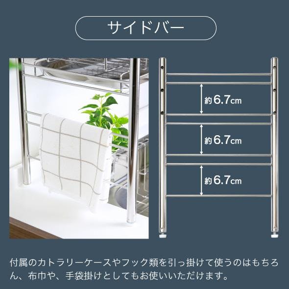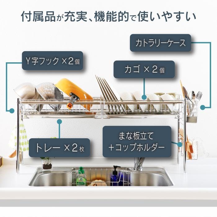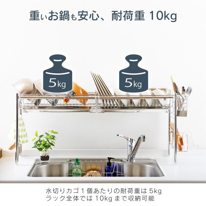 シンク上の空きスペースを利用したシンク上水切りラック。キッチントップがすっきり、作業スペース広々。洗ったその場ですぐ水切りと作業動線も整い、調理も片付けもはかどります。シンクをまたいで設置できる大容量の水切りラック。設置に必要なスペースは4本脚の置き場のみ。カゴは奥行きたっぷりのワイドサイズ、直径28cmのお皿やお鍋を立てて、直径11cmまでのお茶碗なら2列に並べて水切りができます。ラックのフレーム幅は、外寸約86~105cm、内寸約83~102cmの範囲で無段階に伸縮調整可能。