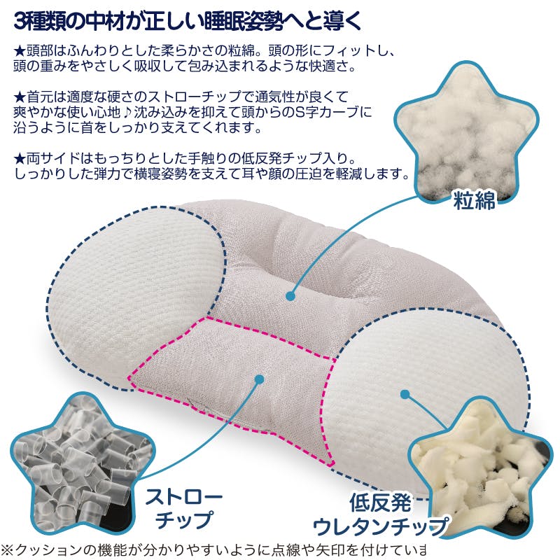 まくらカバー:ニット部/ポリエステル70%・レーヨン30%、クール部/ナイロン90%・ポリウレタン10%/側地:ニット部/ポリエステル70%・レーヨン30%、メッシュ部/ポリエステル100%/中材:ポリウレタン樹脂・ポリエステル・ポリエチレン樹脂