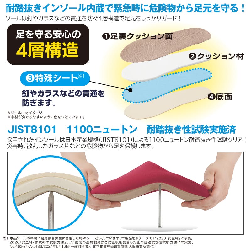 ●本品は室内履き用です。非常時を除き、屋外でのご使用はお避けください。●耐踏抜き試験は、規定された条件での評価結果であり、実際のご使用環境において、すべての鋭利な物に対して完全に防止する物ではありませんのでご了承ください。●本品の耐踏抜き効果は真下からのみ得られます。上部・側面からの突き刺し、貫通には効果がありません。●意図的に危険物を踏む行為はしないでください。●災害時に使用する場合は、出来るだけ危険物の上を避け、ゆっくり歩いてください。