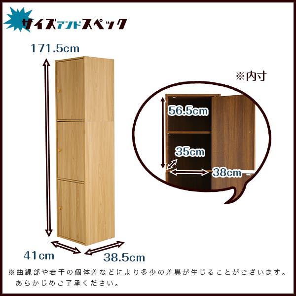 外寸:幅41cm×奥行38.5cm×高さ171.5cm 内寸:幅38cm×奥行35cm×高さ56.5cm 棚板の厚み:1.5cm