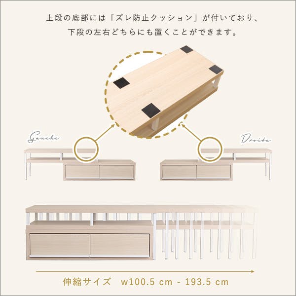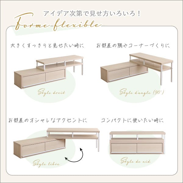 上段と下段の組み合わせて伸縮ができる、さわやかな完成品伸縮テレビ台!伸ばしたり、曲げたり、重ねたり、お好みの形でお使い頂けます。お部屋やテレビのサイズに合わせ、コンパクトにもワイドにも自由なレイアウトが楽しめます。魅せるオープン収納で、天板にはオシャレに小物を置いて自分だけの空間を演出できます。ホワイトアイアン×ホワイト木目の相性はよくお部屋をスッキリ見せれます。