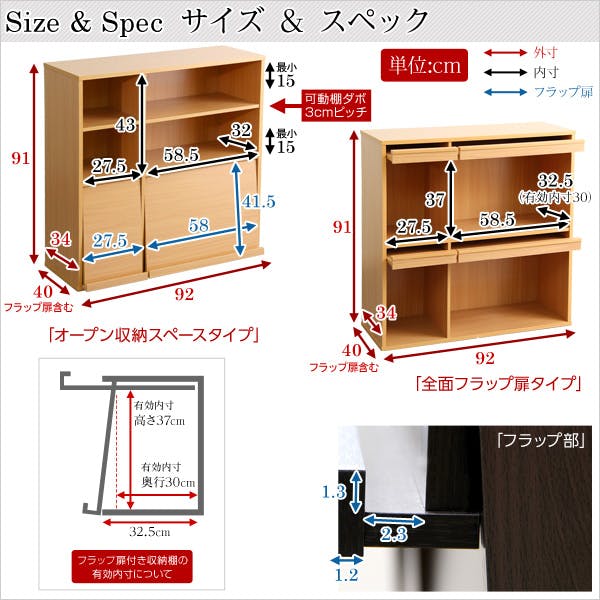 ■サイズ:幅 92cm×奥行 40cm×高さ 91cm(1個あたり) ※1個はフラップ扉が4枚、もう1個はフラップが2枚です
