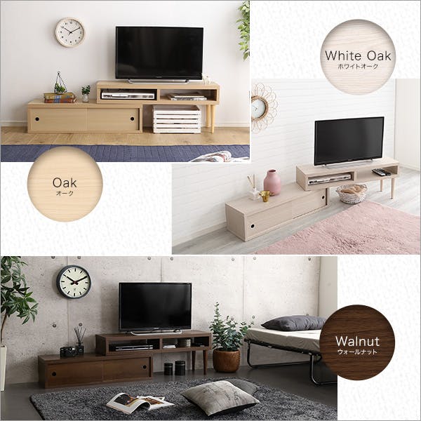 完成品伸縮式テレビ台引き戸タイプ!2梱包でのお届けで脚を取り付けるだけで直ぐにお使い頂けます!薄型テレビに特化したスリム設計の伸縮式テレビ台です。お部屋に合わせてカタチを変えたりして自由自在に設置可能です!カラーは選べる3色展開(WOK、WAL、OAK)!