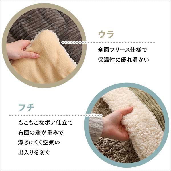 見た目も肌触りも温かなコーデュロイの薄掛けこたつ布団 正方形タイプ。薄型タイプなので、かさばらずすっきりとした印象を与えながら、裏地にはフリース素材を用いているので、保温性の高い仕上がりになっています。使わない時は小さく仕舞える収納袋付き!