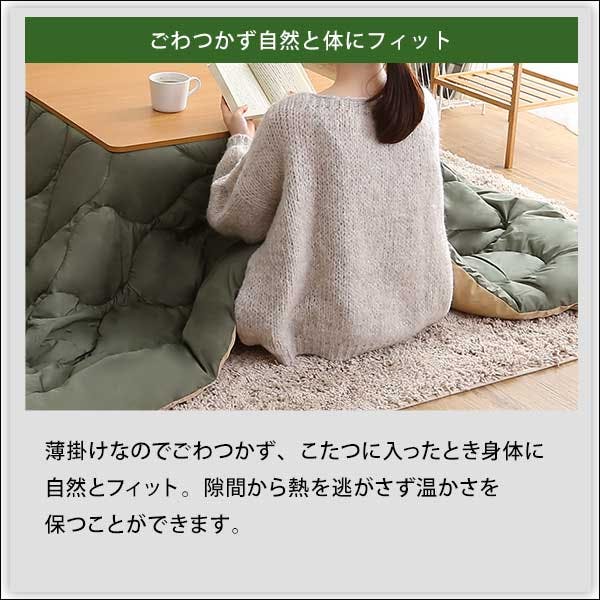 ダウン素材の薄掛けこたつ布団 正方形タイプ。薄型タイプなので、かさばらずすっきりとした印象を与えながら、キルティング加工でふかふかで高い保温性を誇ります。リバーシブルで気分に合わせて選べる色味を選べます。ダウン素材なので、撥水正も高く、ペットなどの毛も絡みにくいので、お手入れラクラク!自宅での洗濯もOK、使わない時は小さく仕舞える収納袋付き!
