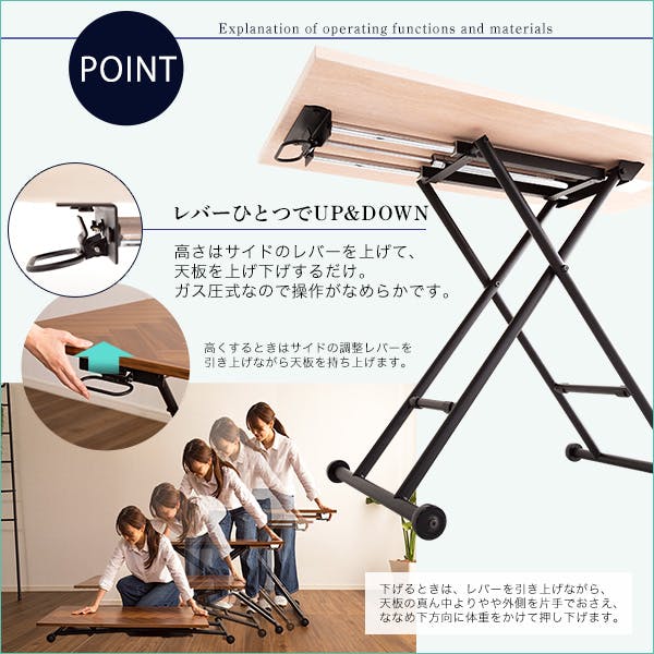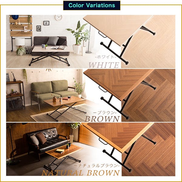 レバー1つで簡単に高さ調整が可能な昇降テーブル!ワークデスクからリビングテーブルまでお部屋や用途に合わせてお使い頂けます。ヘリンボーン柄が美しい天板は幅100x55cmでちょうどよい大きさです。おしゃれなスチール脚はキャスター付きで折りたためるので使わないときにはソファ下のちょっとしたスペースにも収納できます。カラーは温かみのあるホワイト、落ち着いたブラウン、個性を放つナチュラルブラウンの3色です。
