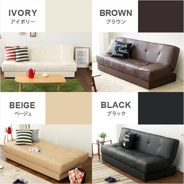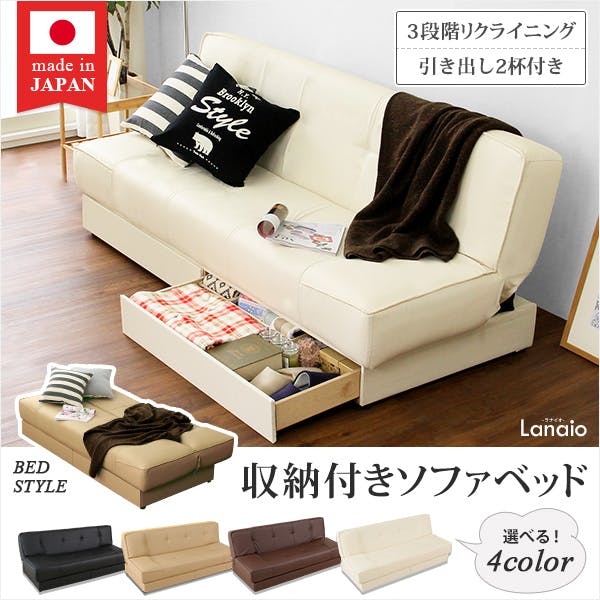 引き出し2杯付き、3段階リクライニングソファベッド(レザー4色)日本製・完成品|Lanaio-ラナイオ-たっぷり収納できる引き出し2杯付きソファベッド!ソファにもベッドにもなる2way仕様!快適な角度でくつろげる3段階リクライニング!確かな品質の日本製ソファです!