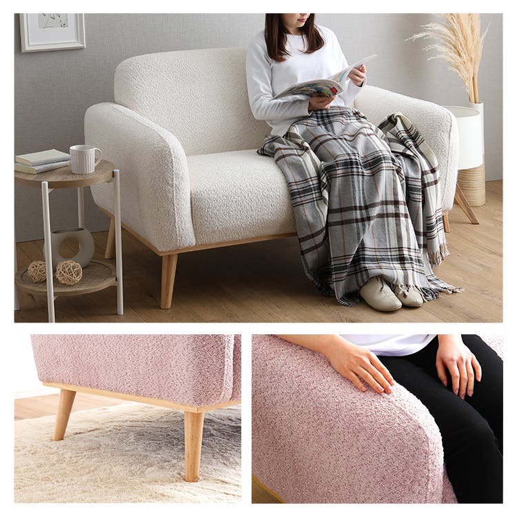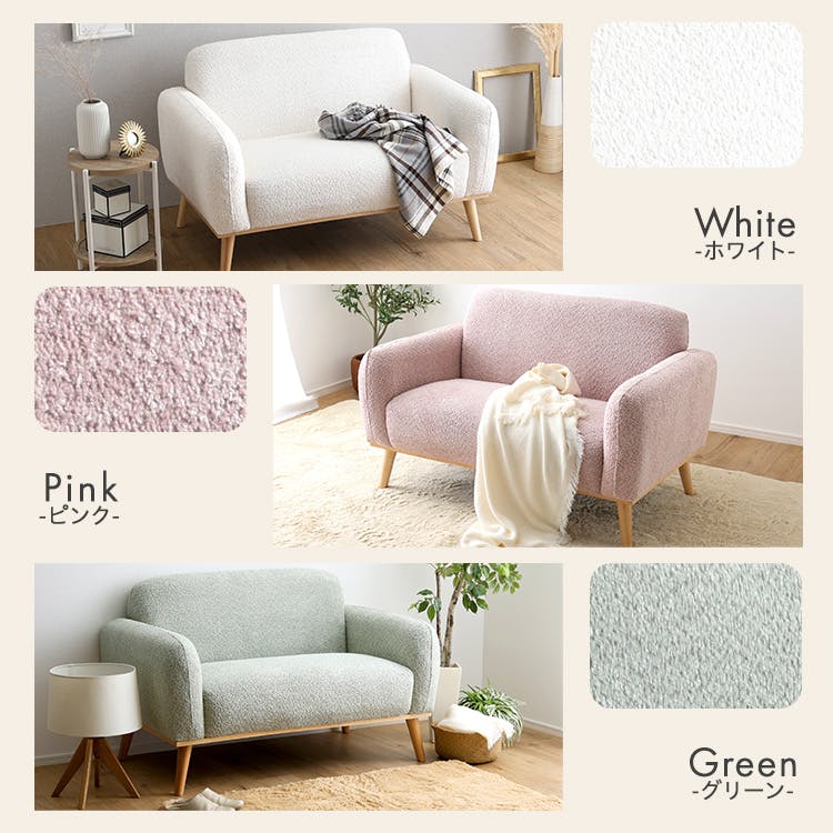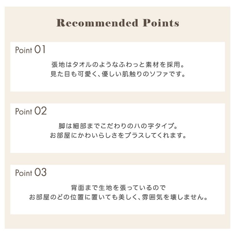 大人かわいいスタイルの2人掛けコンパクトソファ!タオルのような肌触りの張地で見た目も可愛らしいのが特長。コンパクト設計ながら、座面は幅93×奥行54cmとくつろぐのには十分なサイズ感です。