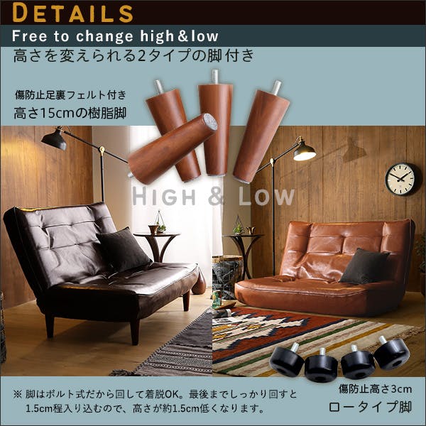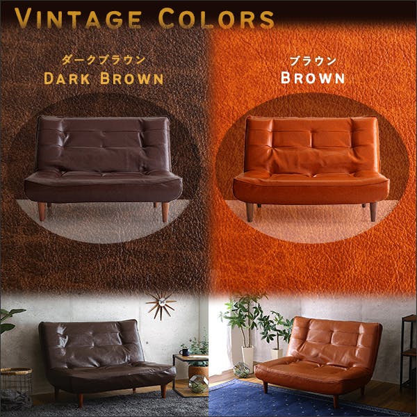 ハイバックの2人掛けリクライニングヴィンテージソファ。 日本製ギア搭載で背もたれの角度を3段階に軽く調節できるソファです。 高級感のあるPVCレザーは水や汚れに強くお手入れしやすい生地。牛革テイストのヴィンテージカラーが雰囲気のある大人部屋を演出します。 2人掛けのワイドシートはポケットコイル仕様の本格派。体を点で支え、長時間でも疲れにくい快適な座り心地です。 脚を外せばロータイプソファとしてもお使い頂けます。