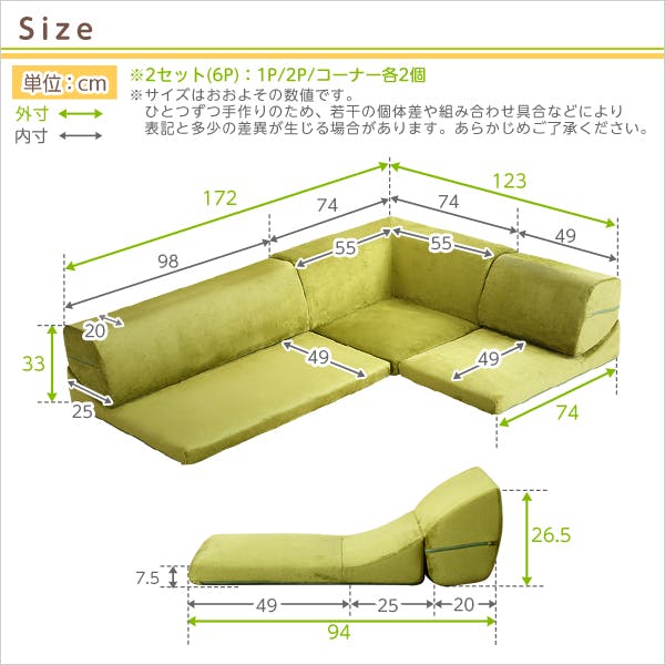 1人掛け:(約)幅49x奥行き74x高さ33cm(座面高:7.5cm) 2人掛け:(約)幅98x奥行き74x高さ33cm(座面高:7.5cm) コーナー:(約)幅74x奥行き74x高さ33cm(座面高:7.5cm) ※各パーツ2個ずつ、商品重量 (約)14.2kg