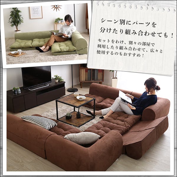 お部屋を広く見せる、フロアタイプソファ!1P、2Pは背もたれリクライニング機能付き! 6つのパーツを自由に入れ替え! 確かな品質・安心の「日本製」 肌ざわりのよいスエード調生地4カラーからお選びいただけます!
