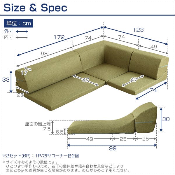 1人掛け:(約)幅49x奥行き74x高さ33cm(座面高:7.5cm) 2人掛け:(約)幅98x奥行き74x高さ33cm(座面高:7.5cm) コーナー:(約)幅74x奥行き74x高さ33cm(座面高:7.5cm) ※各パーツ2個ずつ、商品重量 (約)14.2kg