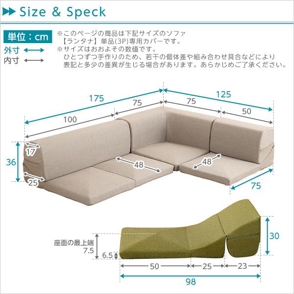 外寸:1人掛け:(約)幅50x奥行き75x高さ36cm(座面高:7.5cm) 2人掛け:(約)幅100x奥行き75x高さ36cm(座面高:7.5cm) コーナー:(約)幅75x奥行き75x高さ36cm(座面高:7.5cm)、商品重量 (約)1.6kg