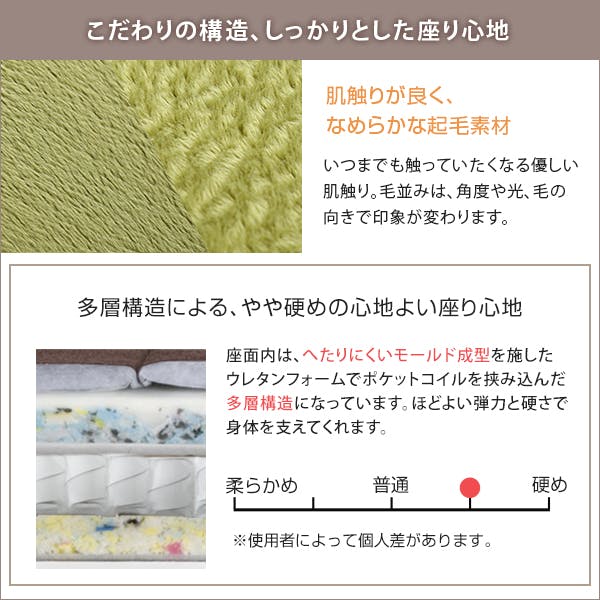 表生地:ポリエステル100%構造材:ウレタンフォーム、ポケットコイル、脚部:ポリプロピレン