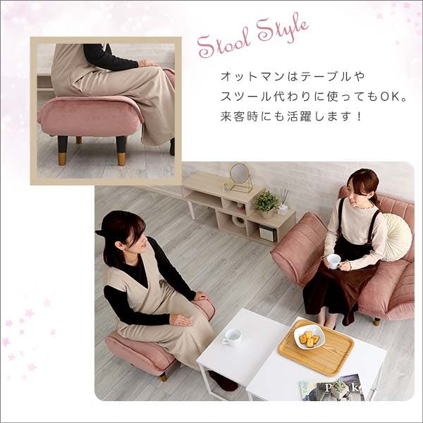 ベロア生地のコンパクトカウチソファ用1人掛け+オットマンセット!高級感もあり、さわり心地のよい人気のベロア生地を採用。大人っぽさを引き立てます!ポケットコイルを使用した、座り心地抜群の多層構造!スツールや簡易サイドテーブルとしても利用可能!圧迫感のないコンパクトサイズで脚を取り外せばロースタイルに!
