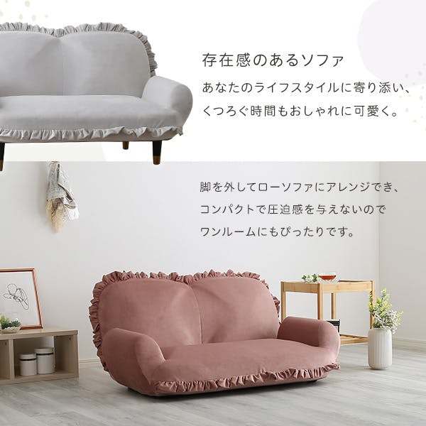 大人かわいいインテリア フリル付きベロアソファ 2人掛け!フリルが目を引く可愛らしいデザインでお部屋の主役に。背もたれは14段階のリクライニングが可能です。座面にはポケットコイルを使用しているので、長時間座っても疲れにくく、機能性も兼ね備えています。