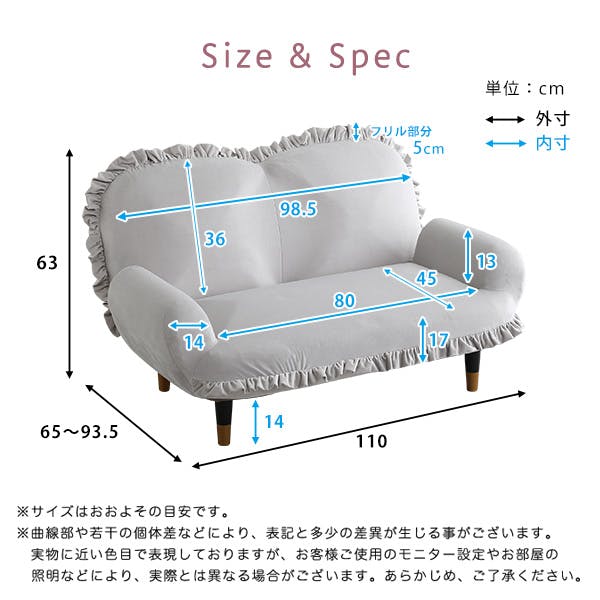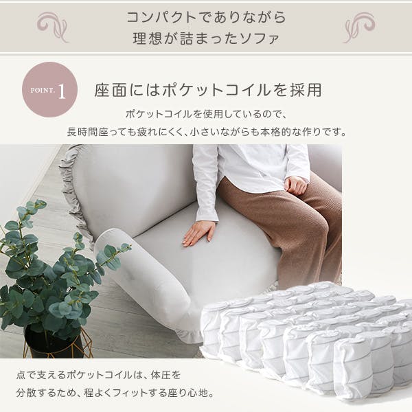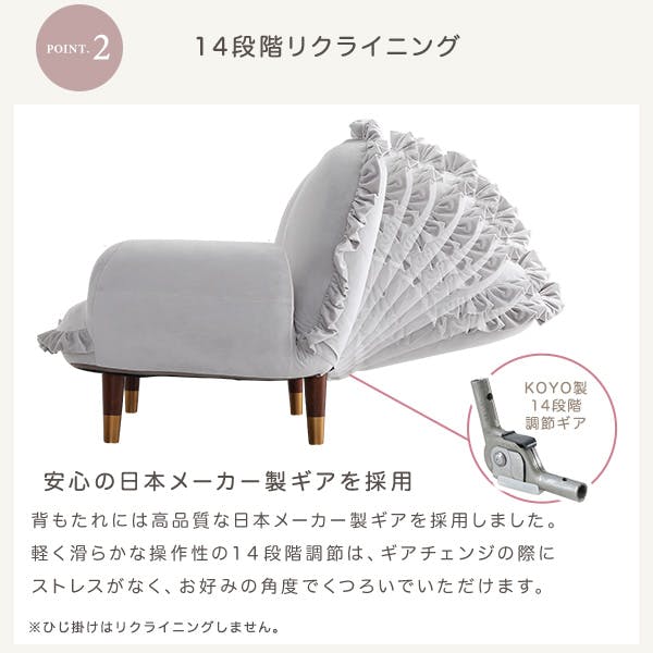 大人かわいいインテリア フリル付きベロアソファ 2人掛け!フリルが目を引く可愛らしいデザインでお部屋の主役に。背もたれは14段階のリクライニングが可能です。座面にはポケットコイルを使用しているので、長時間座っても疲れにくく、機能性も兼ね備えています。