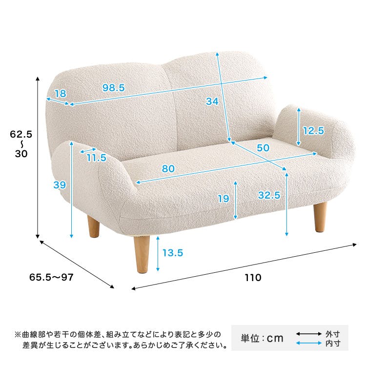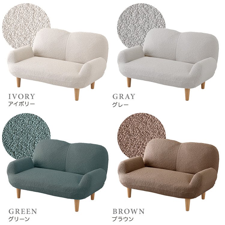 大人かわいいインテリア ブークレソファ 2人掛け!ふわふわ・モコモコした肌触りのブークレ生地を使用したソファです。シンプルなデザインでありながらもやさしく温かみのある雰囲気を感じられます背もたれは14段階のリクライニングが可能です。座面にはポケットコイルを使用しているので、長時間座っても疲れにくく、機能性も兼ね備えています。