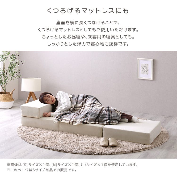 大人かわいいブロックソファ Sサイズ!3種類のサイズ展開で、別売りのM・Lサイズと組み合わせて、ご自身のライフスタイルに合ったレイアウトをお楽しみいただけます。カバーリング仕様なので取り外して洗濯することも可能です。