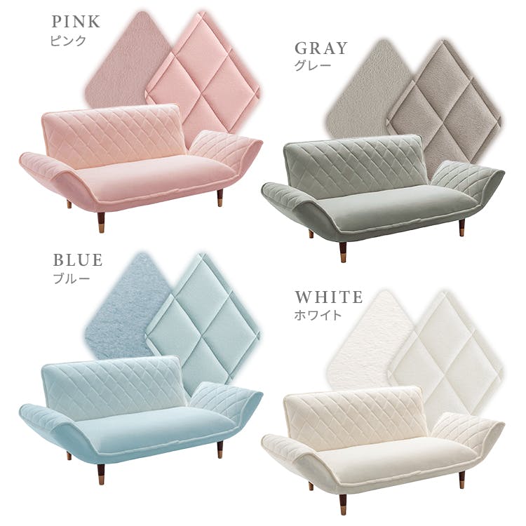 ダイヤモンドキルトのカウチソファー 2人掛け!背もたれとひじ掛けは14段階にリクライニング可能なので、お好きな角度でリラックスしていただけます。背もたれとひじ掛けのダイヤモンドキルトがおしゃれで高級感のある雰囲気を演出します。コンパクトサイズなので、一人暮らしの方にもおすすめです。