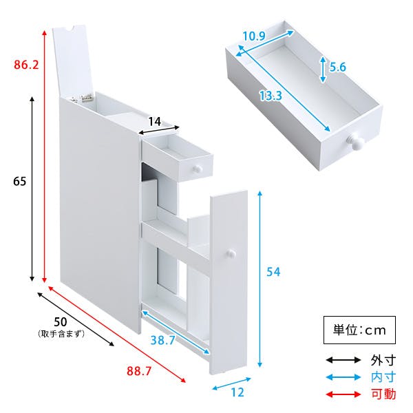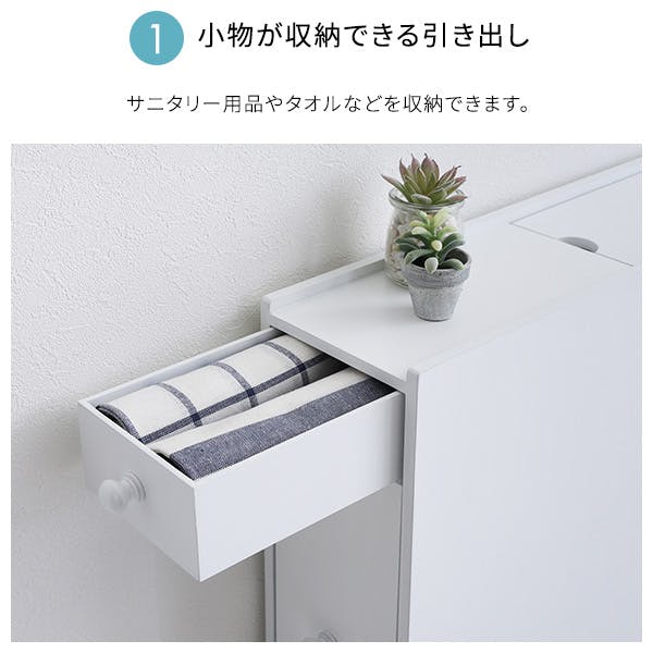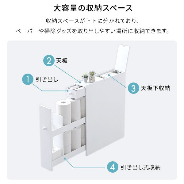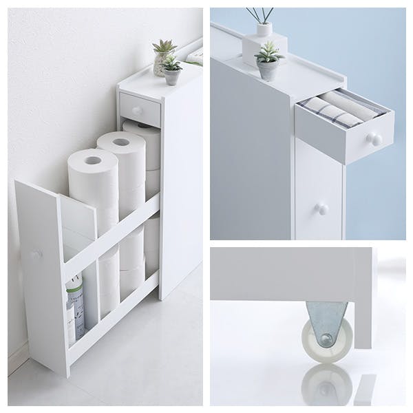 たっぷり収納!スリムトイレラックたっぷり収納できる引出しがあり、とても便利です。明るめのホワイト色のため、トイレの空間を爽やかに見せてくれます。下部の引出しにはキャスターが付いているため、スムーズに開け閉めができます。下部の引出しは上下に収納部分が分かれているため、使い勝手が良いです。