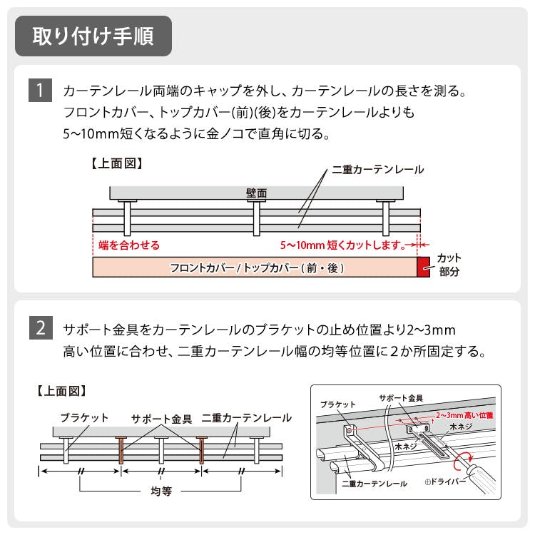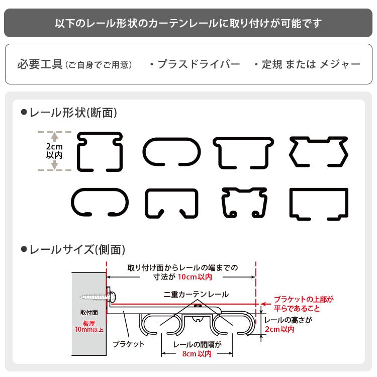 ・長さに合わせてご自身で付属の金ノコにてカットしてご利用ください。 ・取付け可能なレールサイズは、取付け面からレールの先端までの寸法が10cm以内のダブルのカーテンレールです。