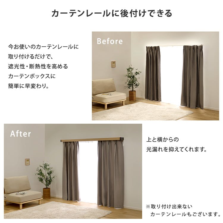 今使っているカーテンレールが、遮光性・断熱性を高めるカーテンボックスに簡単に早変わり!カーテン上部と横からの光漏れを防ぎ、冷暖房効果UP!シンプルな設計でインテリアとして美しいデザインになっています。取付はサイドカバーを取り付け、カーテンレールにカバーを載せるだけ!※取付出来ないカーテンレールもございますので、しっかりとご確認ください。