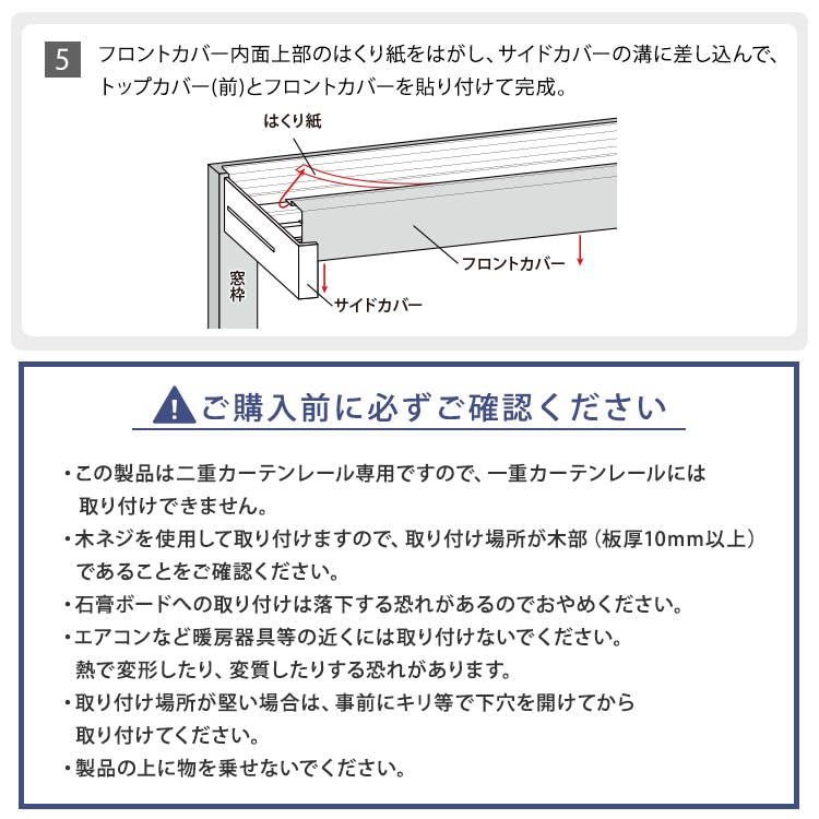 組立時間30分 組立は2人以上で行ってください。 ・ダブルレール専用の為、シングルレールには対応しておりません。 ・木ネジを使用して取り付けますので、取付場所が木部(板厚10mm以上)であることをご確認ください。 ・エアコンなど暖房器具等の近くには取付ないでください。熱で変形したり、変質したりする恐れがあります。