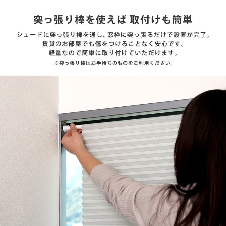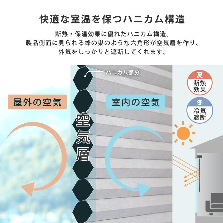 小窓から逃げる熱をカット!フリーカットハニカムブラインド(遮光タイプ)!冬だけでなく、夏の暑さ対策としても効果を発揮するので、室内を年中快適な環境にします。つっぱり棒で取り付けるので、賃貸住宅にも取付OK!幅詰めが自由なので、様々なサイズの窓に対応します。選べるカラーから、お部屋にあったデザインをお選びいただけます。手軽な取付作業でお家を簡単DIY!