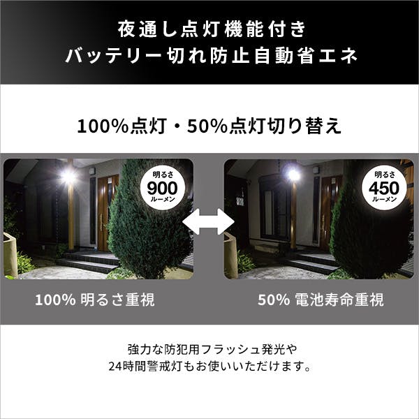最大900ルーメンの5W×2灯フリーアーム式LEDソーラーセンサーライト(ソーラータイプ)!フリーアームなので角度をつけていろんな使い方が可能です!最大探知範囲は180°12mで強力な防犯用アイテムとしてお使い頂けます。夜通し点灯機能でバッテリー切れ防止自動省エネモードに切り替わります!
