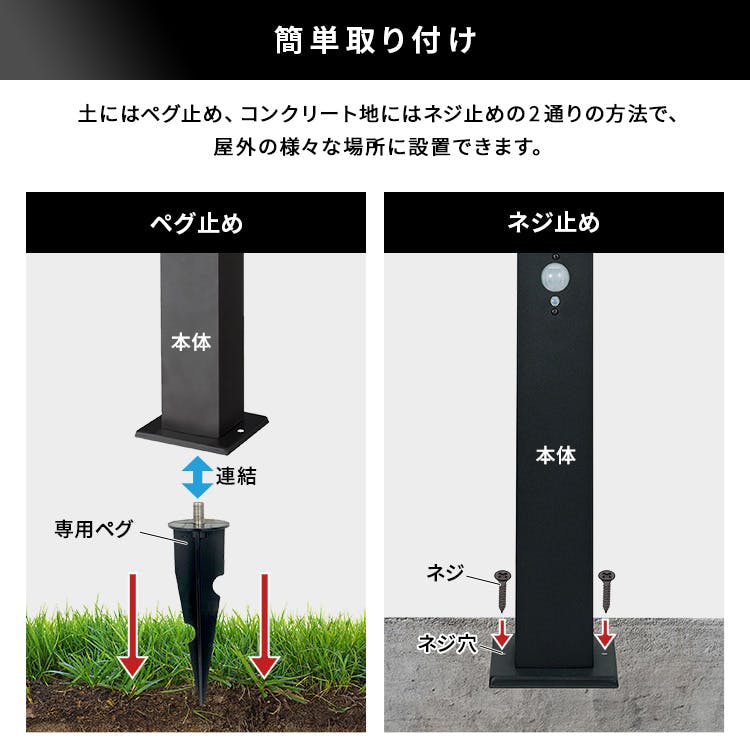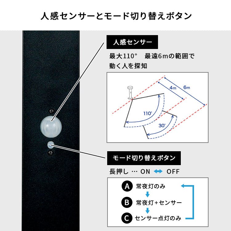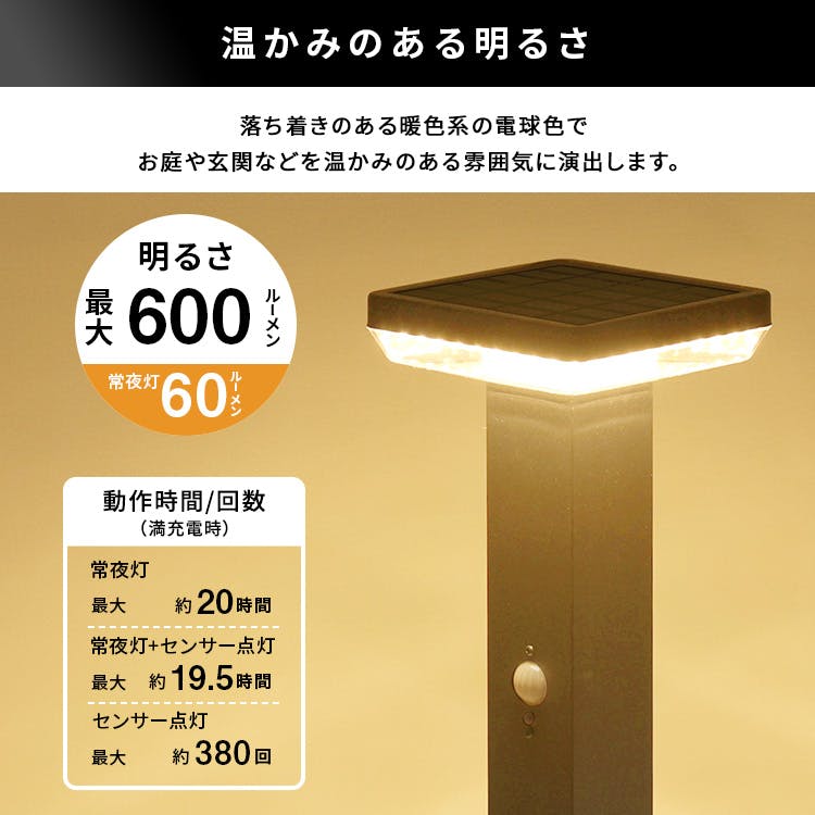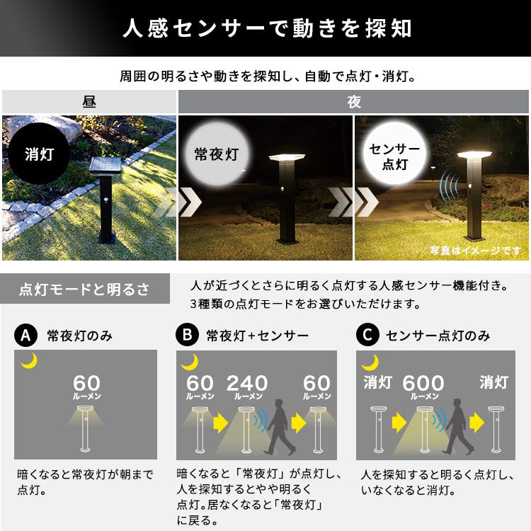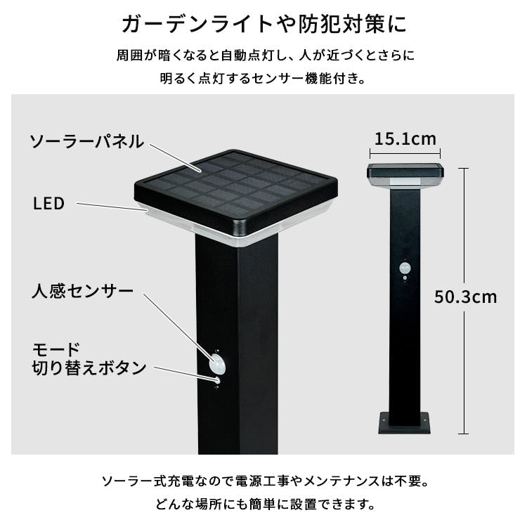 工事不要で、設置するだけのガーデンソーラーセンサーライト!ソーラー発電なので、電源工事やメンテナンスも不要です!3種類の点灯モードで、周囲が暗くなると自動点灯し、人が近づくとさらに明るく点灯するセンサー機能付き!自宅の回りを演出するガーデンライトや、防犯対策にもなります!高級感があるステンレス製なので錆にも強いです!常夜灯は60ルーメン、センサー反応で600ルーメンの明るさ!
