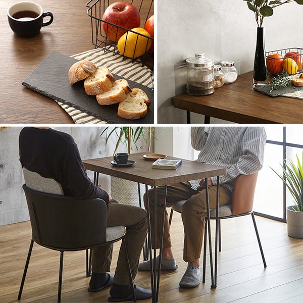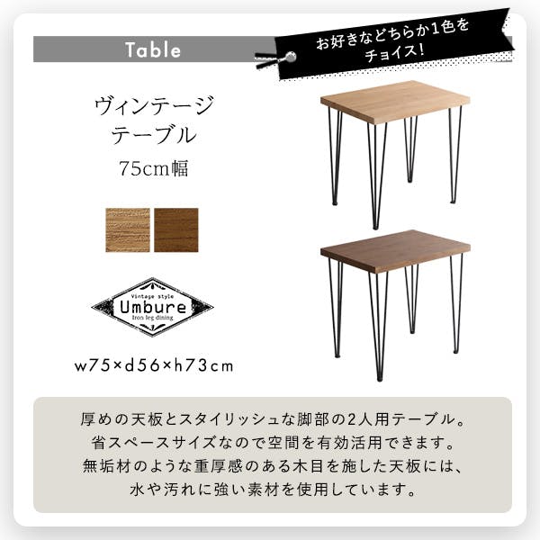 レザーとファブリックを組み合わせたダイニングチェア2脚と75cm幅テーブルの3点セット!チェアは2色から1色もしくは2色、テーブルは2色からお選びください。チェアはゆったりくつろげるクッション性とフィット感が魅力。2種類の生地と繊細なスチール脚がマッチしたデザインで、ヴィンテージ調のテーブルにも良くマッチします。テーブルは、天板に水や汚れに強いPVCを使用。触感にこだわった木目を側面まで施し、無垢材のような重厚感を持たせています。1人暮らしや2人暮らしの人にピッタリのダイニングセットです。