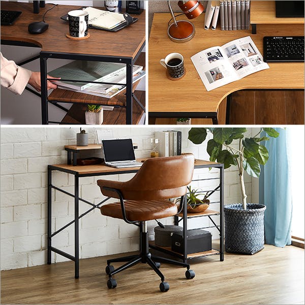 ヴィンテージテイストのL字デスクとガス圧昇降式チェアセット!チェアは4色から、テーブルは2色からお選びください。昔の映画に出てきたBARBER SHOPに置かれていたような、どこか懐かしい雰囲気を持ったチェアとヴィンテージ調のL字パソコンデスクのセット。風合いのあるカラーPU生地が落ち着いた印象を醸し出し、ヴィンテージ調のデスクとマッチします。デスクの天板はリアルな木目を再現しています!お部屋のレイアウトに合わせて、棚位置を変更できるリバーシブルタイプ。ご自宅でのデスク作業にピッタリです!