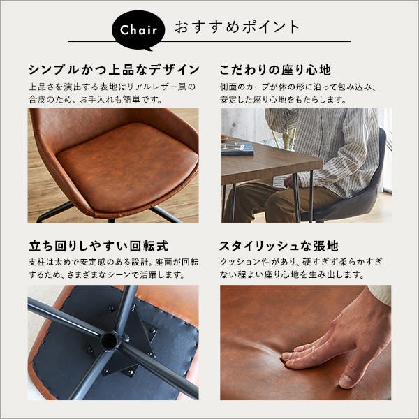 スタイリッシュなデザインのダイニング チェアとヴィンテージ調のテーブルセット。チェアはシーンを選ばないシンプルなフォルムと表地のレザーが上品さを演出しており、ヴィンテージ調のテーブルと相性抜群です。テーブルの天板には、水や汚れに強いPVCを使用。触感にこだわった木目を側面まで施し、無垢材のような重厚感を持たせています。厚みのある天板とオブジェのような脚部のコントラストがオシャレさを演出しています。1人暮らしや2人暮らしの人にピッタリのチェアとテーブルのセットです。