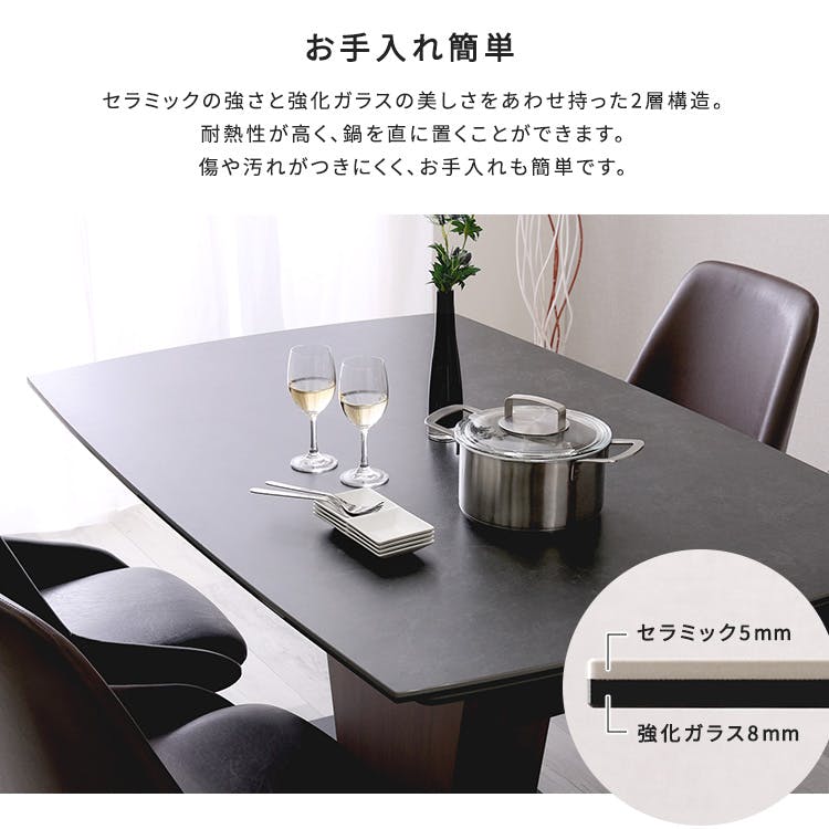 天板:セラミック5mm+強化ガラス8mm 本体:スチール(木目はラミネート貼り) 脚部:スチール(粉体塗装)