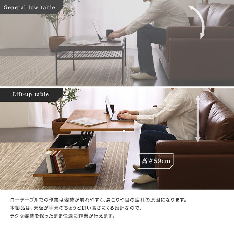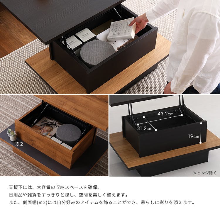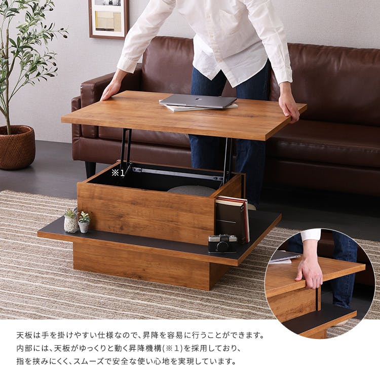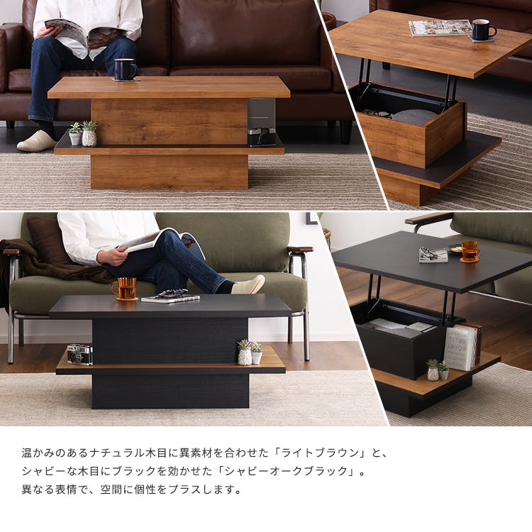 ヴィンテージ調のリフトアップセンターテーブル!スタイリッシュなデザインでお部屋をオシャレ空間に!リフトアップする天板が、日常の様々なシーンで大活躍します!また天板の下に収納スペースがあり、お部屋スッキリ!届いたらすぐ使える完成品です!