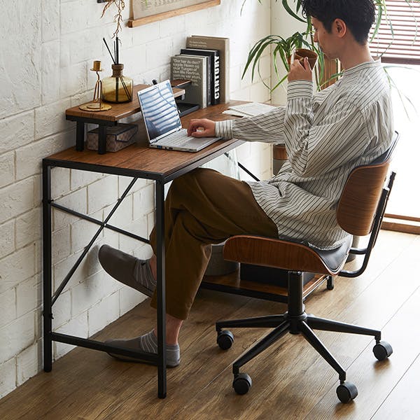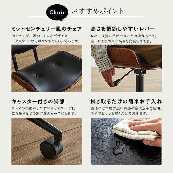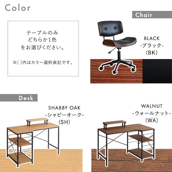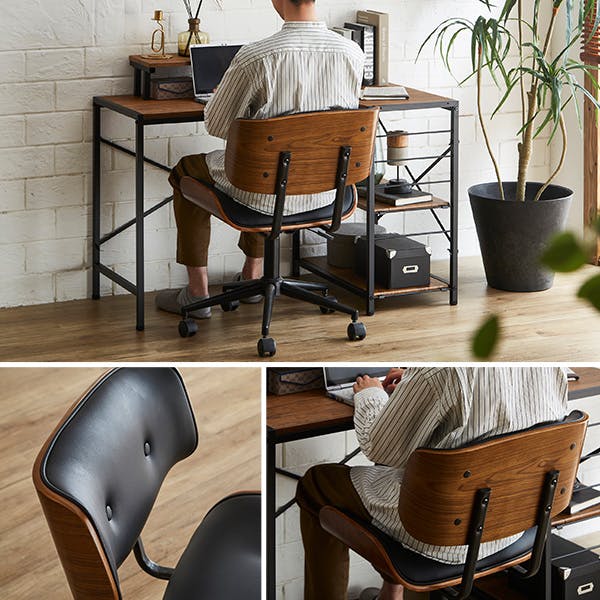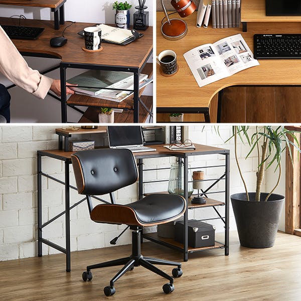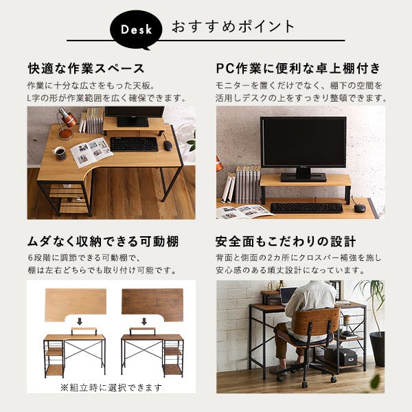 丸みを帯びた曲木と異素材の組み合わせが美しいチェアとヴィンテージ調のL字パソコンデスクのセット。皮革と曲木を巧みに組み合わせたデザインのチェアとヴィンテージ調のデスクが高級感を漂わせます。デスクの天板はリアルな木目を再現しています!お部屋のレイアウトに合わせて、棚位置を変更できるリバーシブルタイプ。