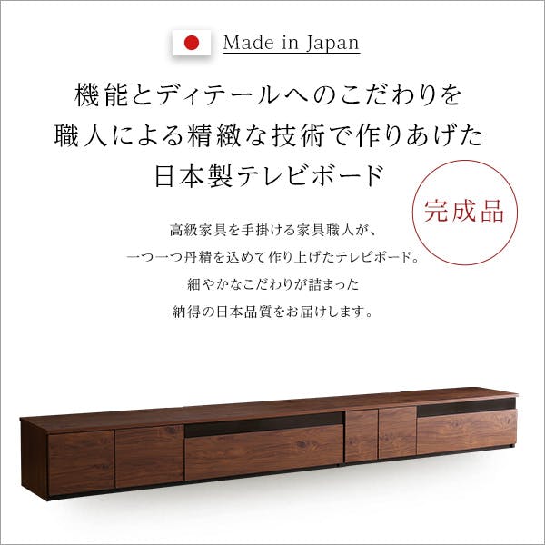 日本製の完成品テレビボード幅320cmタイプ!国産の精巧な作りで見た目も美しく、お部屋に高級感をもたらしてくれること間違いなしです。収納部分は大容量の引き出し収納と扉収納。そしてAV機器などを置けるオープン収納があります。背面部分はコードがかさばらないよう、計算された作りなので正面からスッキリと見えます。見た目と使いやすさを兼ね備えたテレビボードです。※こちらは140cmと180cmのテレビボードを組み合わせた商品です。