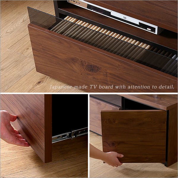 日本製の完成品テレビボード幅90cmタイプ!国産の精巧な作りで見た目も美しく、お部屋に高級感をもたらしてくれること間違いなしです。収納部分は大容量の引き出し収納と扉収納。そしてAV機器などを置けるオープン収納があります。背面部分はコードがかさばらないよう、計算された作りなので正面からスッキリと見えます。見た目と使いやすさを兼ね備えたテレビボードです。