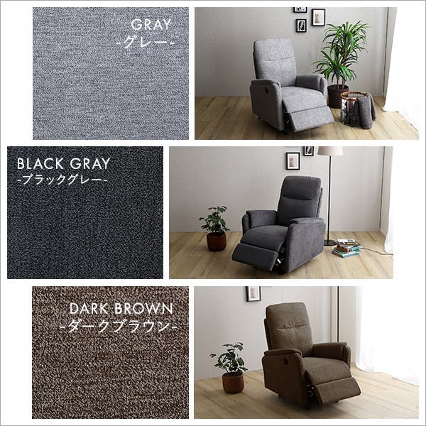 温かみのあるファブリック!1人掛け電動リクライニングソファ!落ち着いた色味の3色からお選びいただけます。ドイツのOKIN社製のモーターをしているので、安心してご利用いただけます。ひじ掛け横のボタンで簡単に上げ下げを操作することができます。温かみのある落ち着いた色味のファブリック生地は、様々なお部屋のテイストにマッチします。