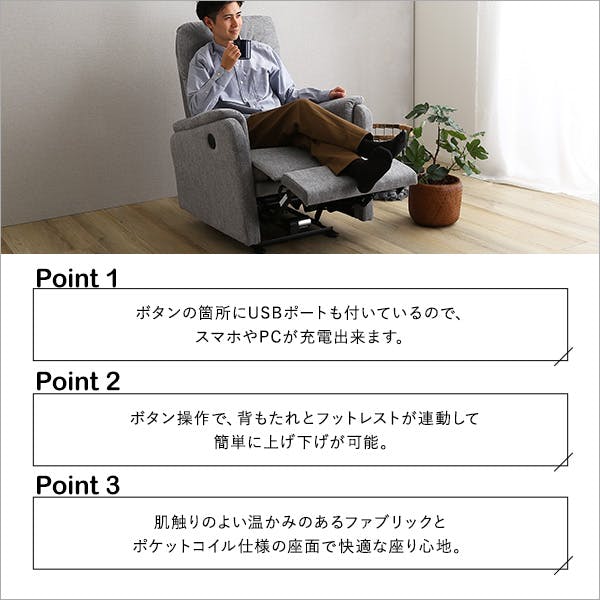 温かみのあるファブリック!1人掛け電動リクライニングソファ!落ち着いた色味の3色からお選びいただけます。ドイツのOKIN社製のモーターをしているので、安心してご利用いただけます。ひじ掛け横のボタンで簡単に上げ下げを操作することができます。温かみのある落ち着いた色味のファブリック生地は、様々なお部屋のテイストにマッチします。