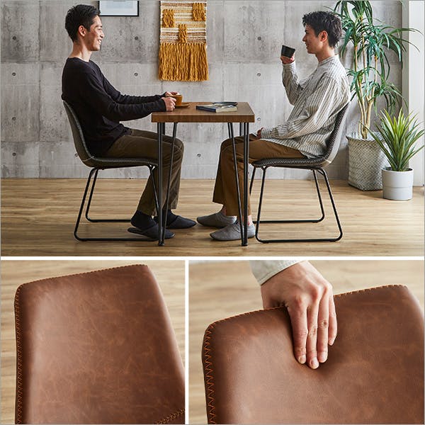 スクエアチェア2脚(同色)と75cm幅ヴィンテージテーブルの3点セット!チェアは3色から1色、テーブルは2色からお選びください。チェアは座面・背もたれが曲線となっているので身体を包み込みフィットします。スチール脚は身体を面で支える台形デザインを採用。ブラックスチールがテーブルの脚ともよく合い、相性抜群です!テーブルの天板には、水や汚れに強いPVCを使用。触感にこだわった木目を側面まで施し、無垢材のような重厚感を持たせています。1人暮らしや2人暮らしの人にピッタリのダイニングセットです。