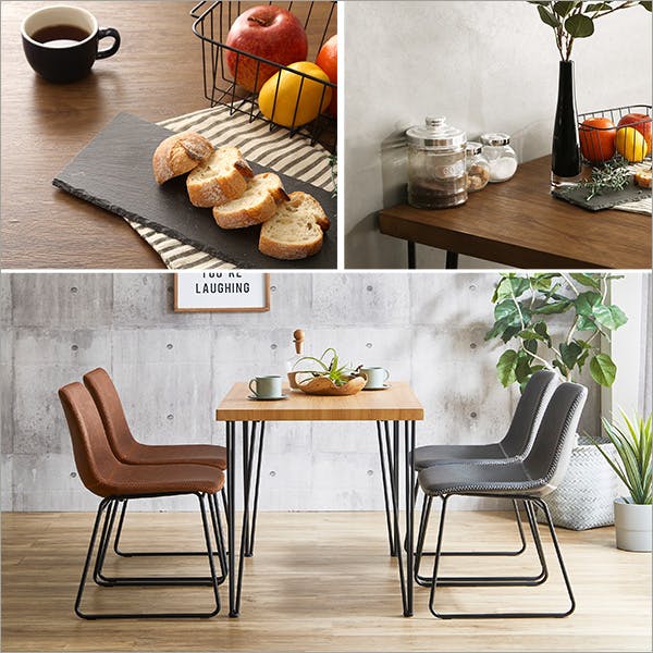 スクエアチェア4脚と110cm幅ヴィンテージテーブルの5点セット!チェアは3色から1色もしくは2色、テーブルは2色からお選びください。チェアは座面・背もたれが曲線となっているので身体を包み込みフィットします。スチール脚は身体を面で支える台形デザインを採用。ブラックスチールがテーブルの脚ともよく合い、相性抜群です!テーブルの天板には、水や汚れに強いPVCを使用。触感にこだわった木目を側面まで施し、無垢材のような重厚感を持たせています。2人暮らしやファミリーの人にピッタリのダイニングセットです。