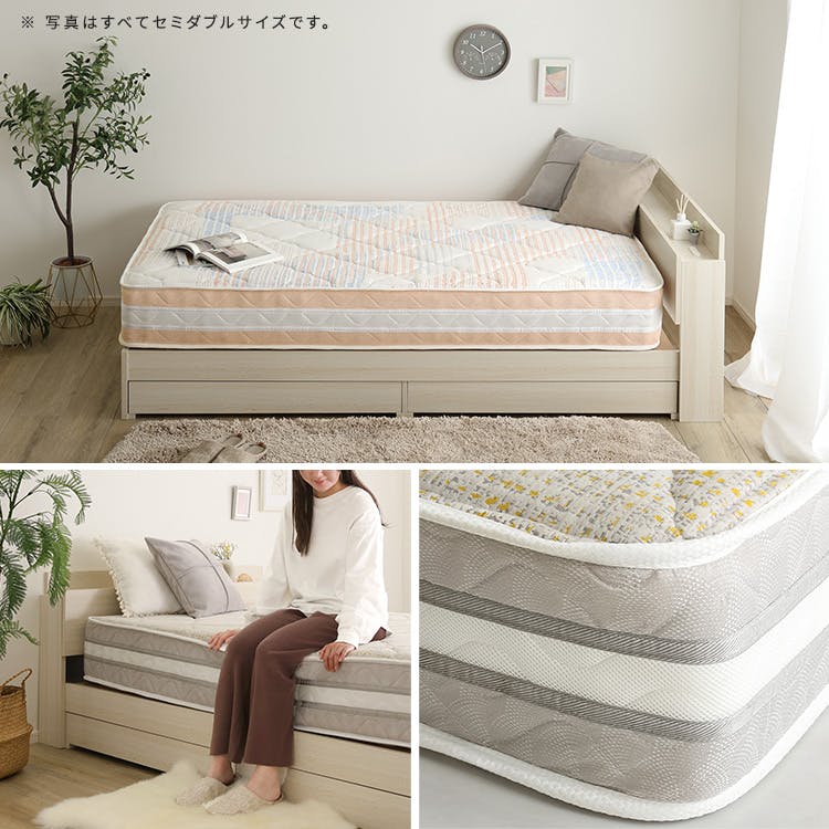 表生地:ポリエステル100% 側生地:ポリエステル100% マット中材:ポケットコイル、ウレタン、不織布、防ダニ抗菌綿、【商品重量】ソフト:(約)39kg レギュラー:(約)41kg ハード:(約)48kg