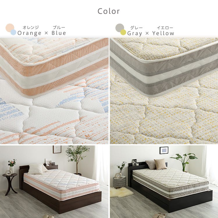 硬さとカラーが選べる日本製ポケットコイルデザインマットレス!ポケットコイルにより、体重を分散させた負担のない自然な寝姿勢を保つことができます。端の落ち込みを軽減するエッジハードを採用!全方位をメッシュ生地にすることで通気性が抜群です。また抗菌綿を使用しており、防ダニ・抗菌防臭効果を発揮します。厳しいJIS規格の8万回の耐久試験にもクリアしました!両面仕様のリバーシブルですので、長くお使い頂けます。